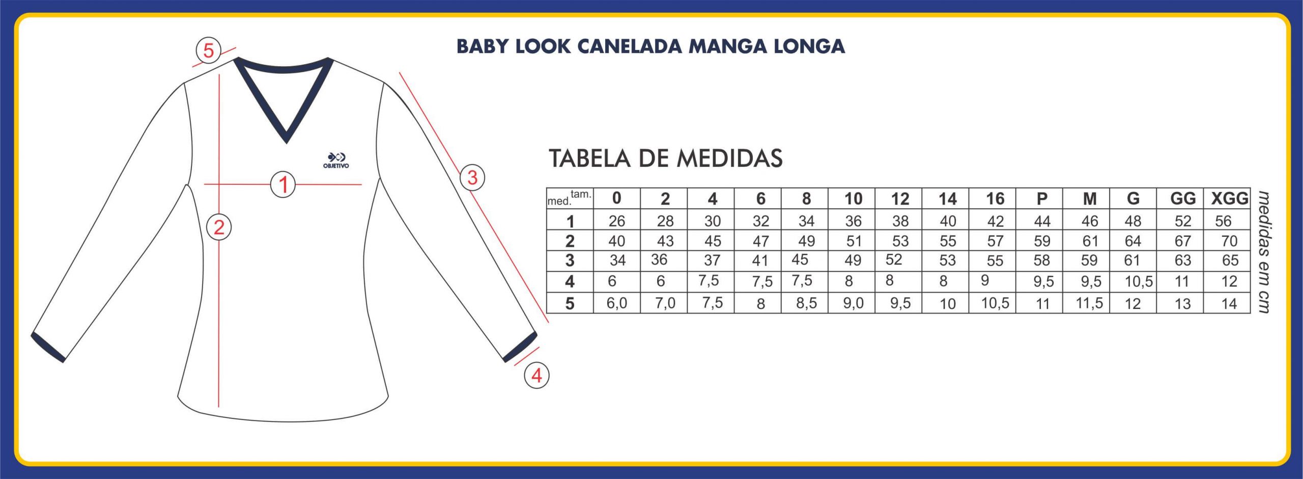Camiseta baby look manga longa em malha canelada com acabamento no decote e nas mangas com detalhe azul marinho. Logomarca bordada.