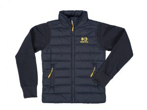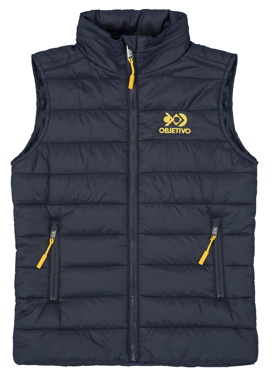 Colete unissex de inverno com capuz embutido, zíper e bolso interno. Tecido externo 100% poliamida. Forro e enchimento 100% poliéster.